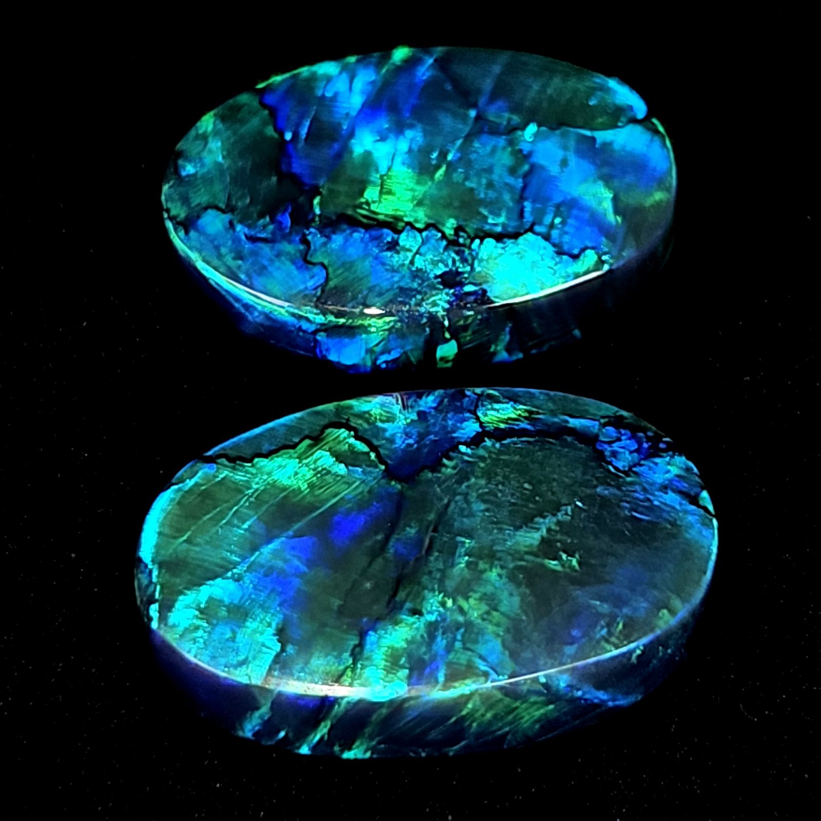 LIGHTNING RIDGE BLACK OPAL SET, “THE SISTERS” OPAL PAIR: From Earth Perfection💎, step into a world where Earth meets the cosmos with this extraordinary pair of Australian Lightning Ridge black opal cabochons. Each piece is a rare gem, a unique testament to nature’s artistry, showcasing a breathtaking tapestry of deep blue and turquoise-aqua-green swirls that mimic the vastness of the galaxy. As you behold these opals, it’s as if you’re gazing into a swirling night sky, where vibrant lightning strikes of color dance playfully across the surface.