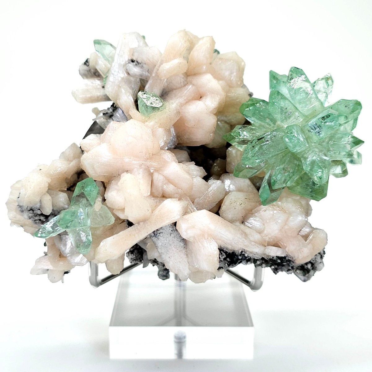 From Earth Perfectionđ, this extra large cabinet size green Apophyllite flower and Stilbite is pristine and the pinnacle of any mineral collection. The 2â radius large green flower crystal sprays catch light from absolutely every angle and some boast stunning rainbow reflections. Nicely accented by clusters of lustrous and cream-colored Stilbite, with a subtle peach hue, the base also showcases a mix of calcite and basalt remnants that shimmer with wonder and display a beautiful contrast! In exquisite condition, this gemmy jewel-like green Apophyllite flower crystal is pristine and a sight to behold.Â