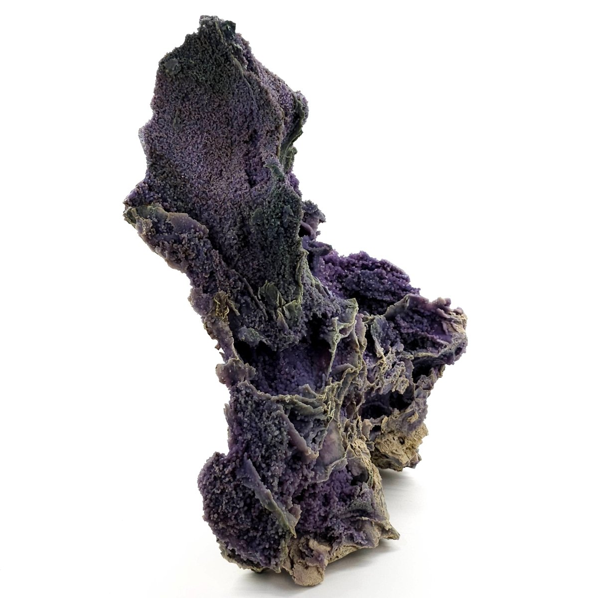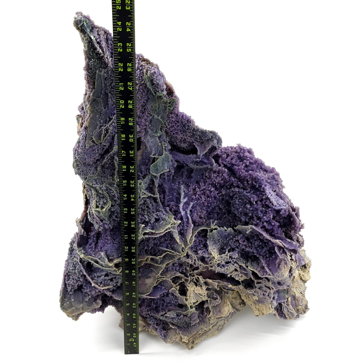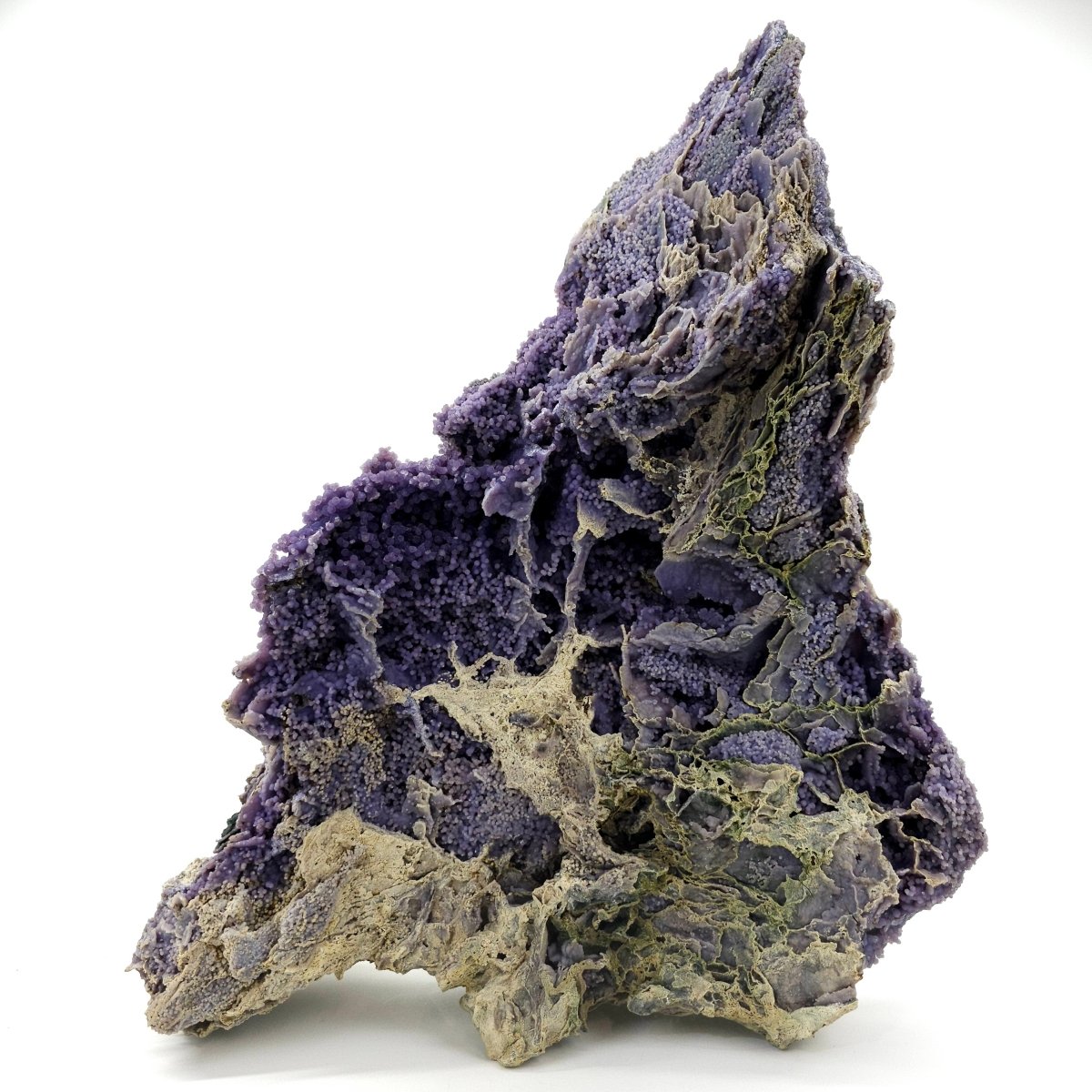 GRAPE AGATE: From Earth Perfection this extraordinary Grape Agate crystal cluster sculpture is an extremely rare find, weighing in at a massive 78 lbs! Featuring spectacular museum quality botryoidal, purple chalcedony, green and blue shades, along with fine botryoidal druze, mother-rock webbing, shimmering sparkles, and intricate natural caverns and caves, this one-of-a kind specimen is exquisite, a true mineral collector's dream. Grand in size, high quality, and shimmering with beauty, this radiating treasure captivates all eyes.